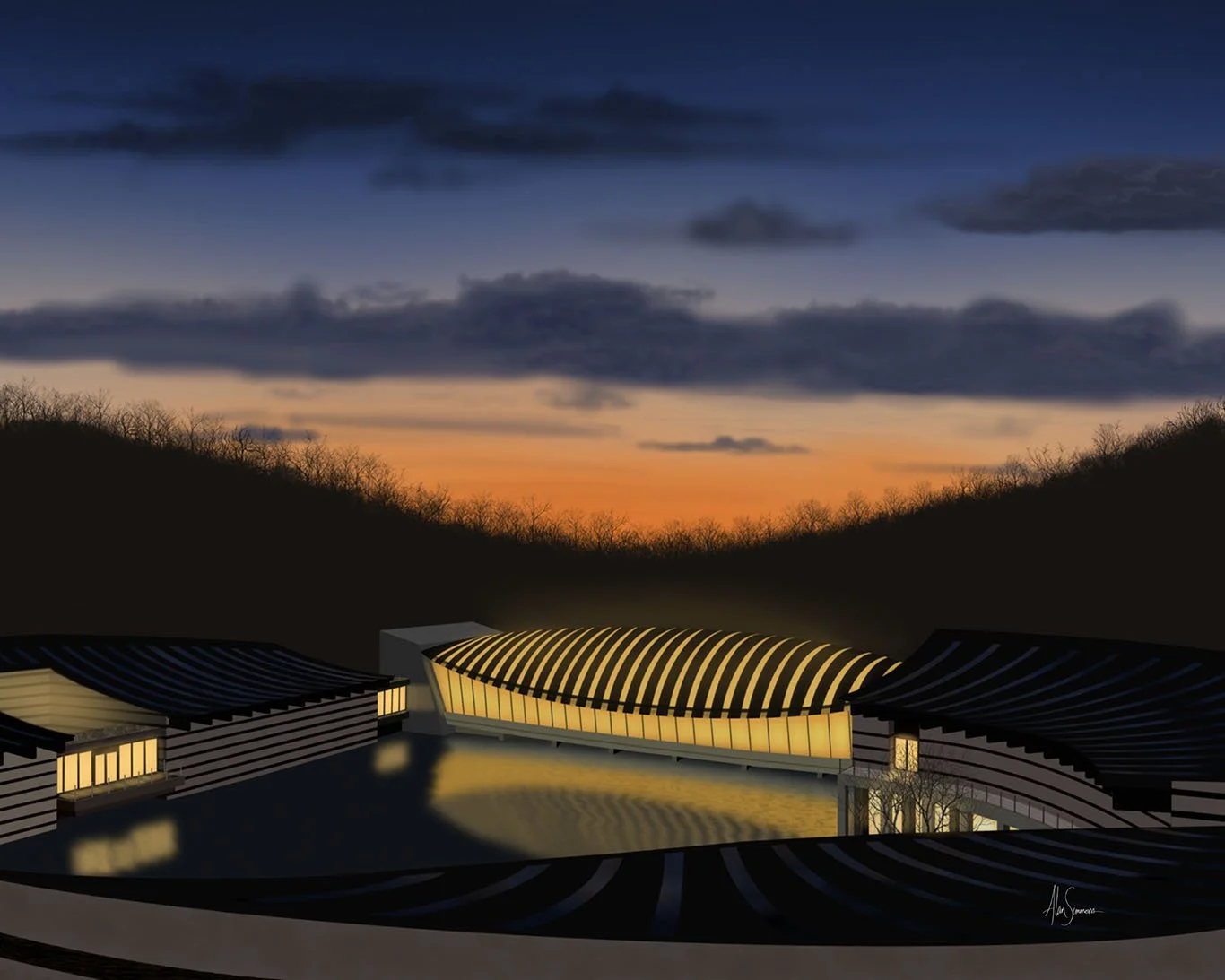Crystal Bridges (2023) is one of five pieces in my Bentonville Sunsets collection. It features a sweeping view of the iconic museum against a dusky sunset. The windows are illuminated from within and reflect a warm glow on the museum’s spring-fed ponds. Hand-drawn digital art. Prints available in 20 x 16, 10 x 8, and 7 x 5.