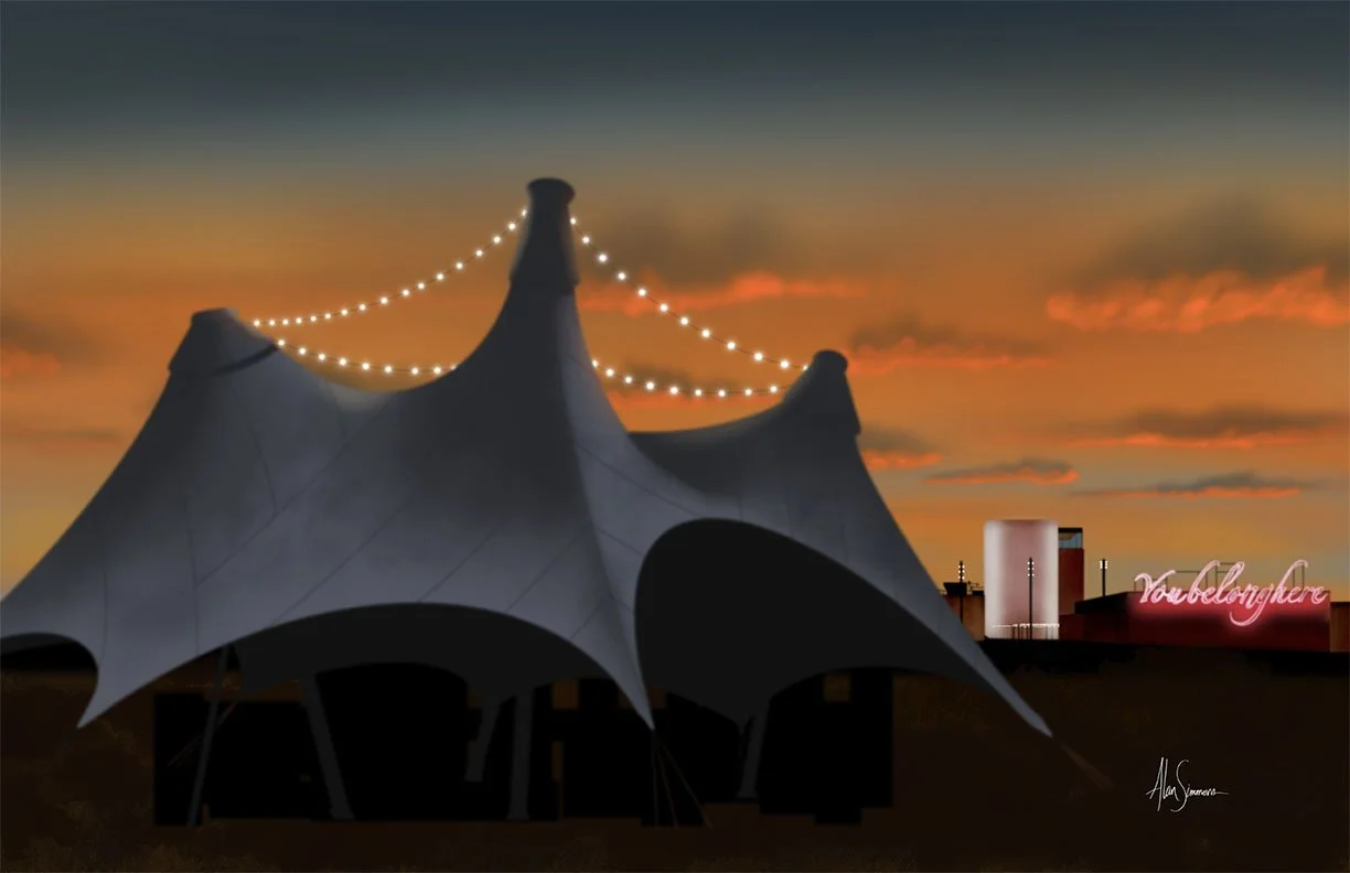 The Momentary (2023) is one of five pieces in my Bentonville Sunsets collection. It features the familiar pavilion, the main building, and the iconic neon “You belong here” sign against the backdrop of a fiery, dramatic sunset. Hand-drawn digital art. Prints available in 30 x 20, 10 x 8, and 7 x 5.