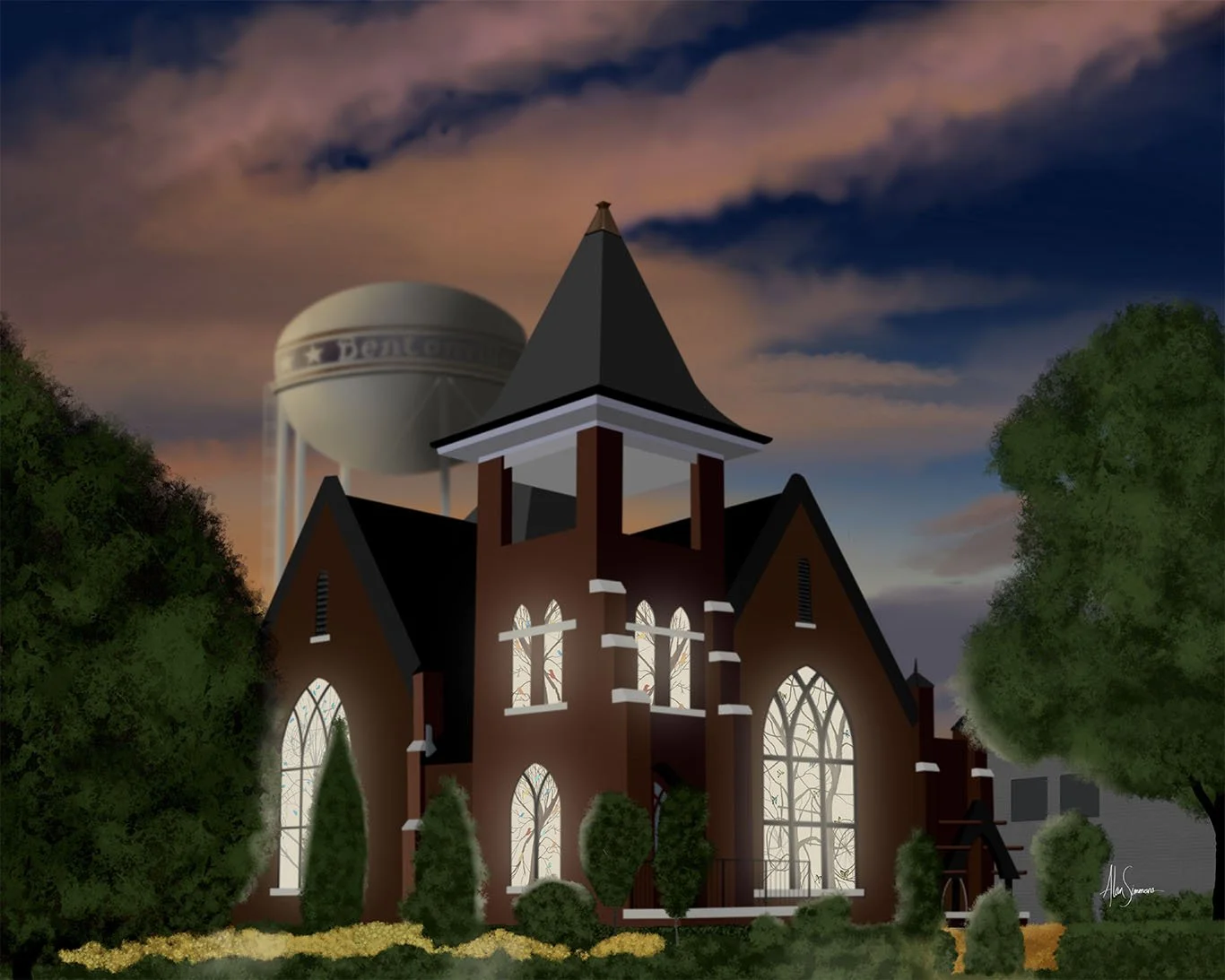 Preacher’s Son (2023) is one of five pieces in my Bentonville Sunsets collection. It features the familiar church-turned-restaurant and Bentonville water tower against a dusky sunset. The windows are illuminated from within and feature a rendering of the beautiful birds and branches artwork created by renowned local artist George Dombek. Hand-drawn digital art. Prints available in 20 x 16, 10 x 8, and 7 x 5.