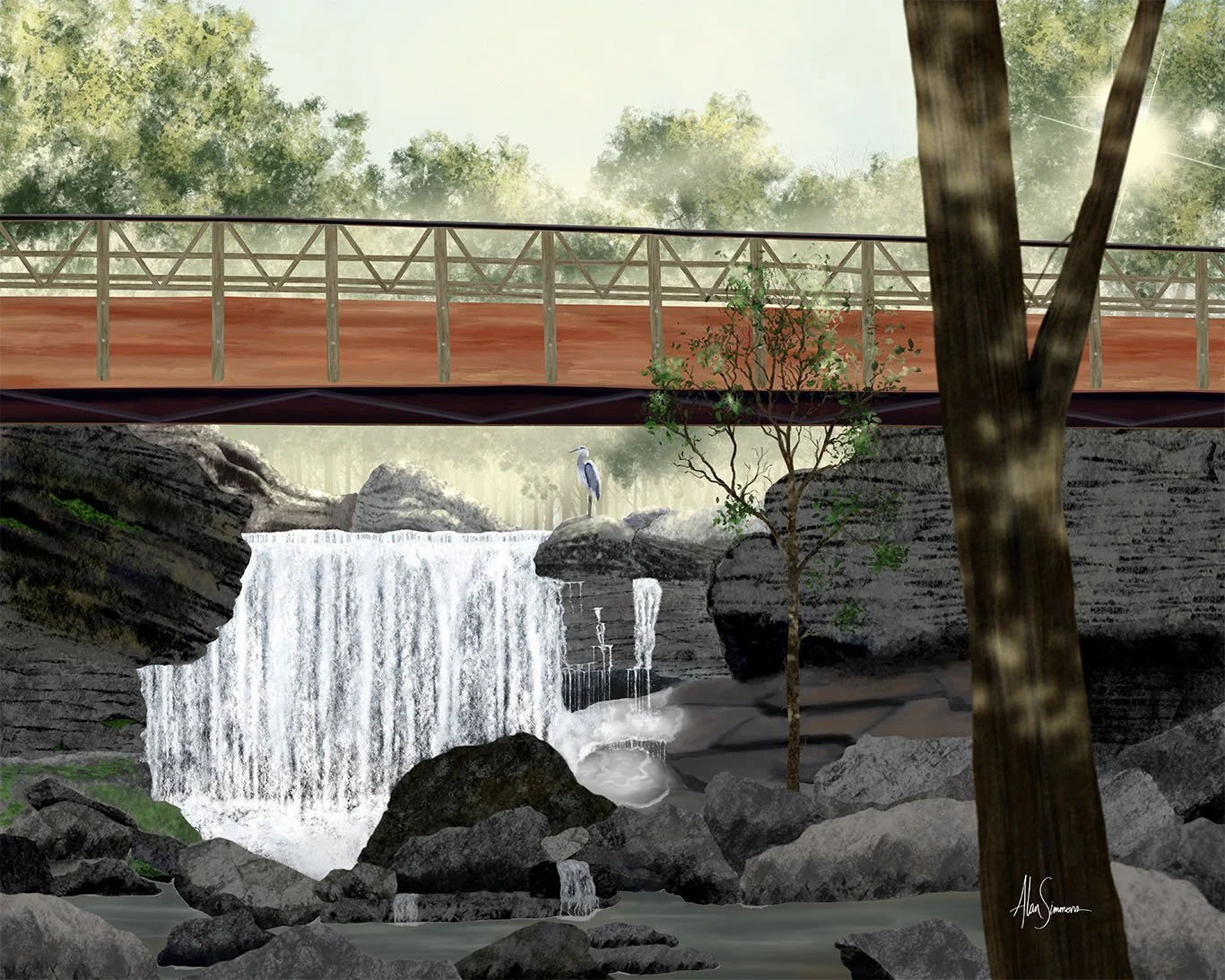 Pinion Creek Falls (2023) features a low-angle view of the beautiful waterfall at Lake Ann in Bella Vista. Morning sun spills through the trees to highlight the rushing falls and a heron, who is a frequent visitor. Hand-drawn digital art. Prints available in 20 x 16, 10 x 8, and 7 x 5.