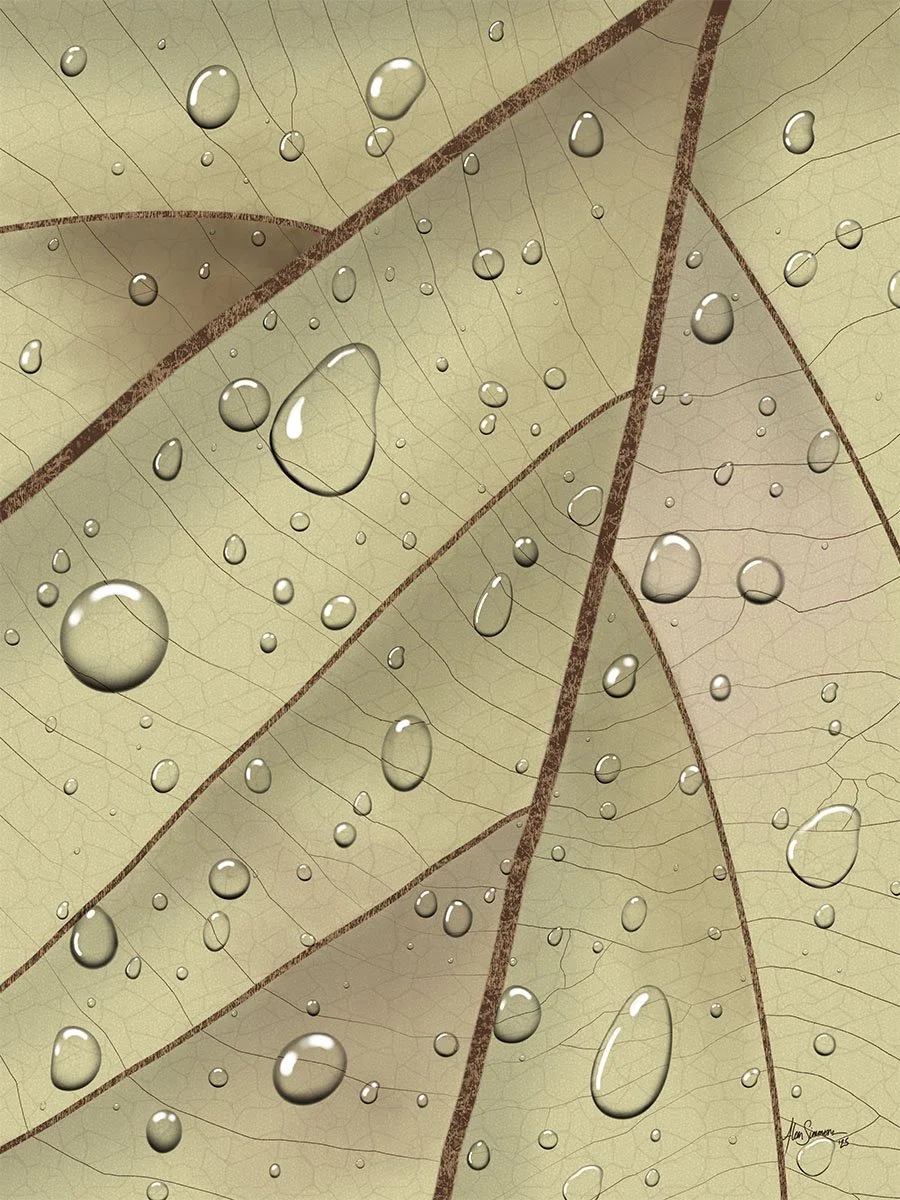 Dew (2025) features a macro view of a fallen leaf. Small veins extend from the midrib and spread across the lamina. Upon closer inspection, even smaller veins and tiny venules are visible, slightly magnified by water droplets that cling to the surface and catch the morning light. Hand-drawn digital art. Prints available in 18 x 24, 10 x 8, and 7 x 5.