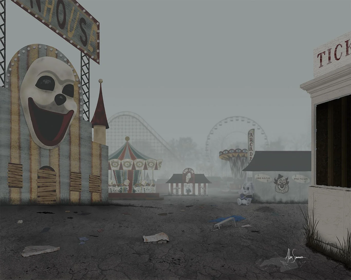 Midway (2024) is one of five pieces in my Abandoned collection, and features the desolate grounds of an abandoned amusement park. Decaying rides and buildings are shrouded in a blanket of fog, and the boarded-up funhouse leaves one with the unsettling feeling that something horrible must have happened here. Hand-drawn digital art. Prints available in 20 x 16, 10 x 8, and 7 x 5.