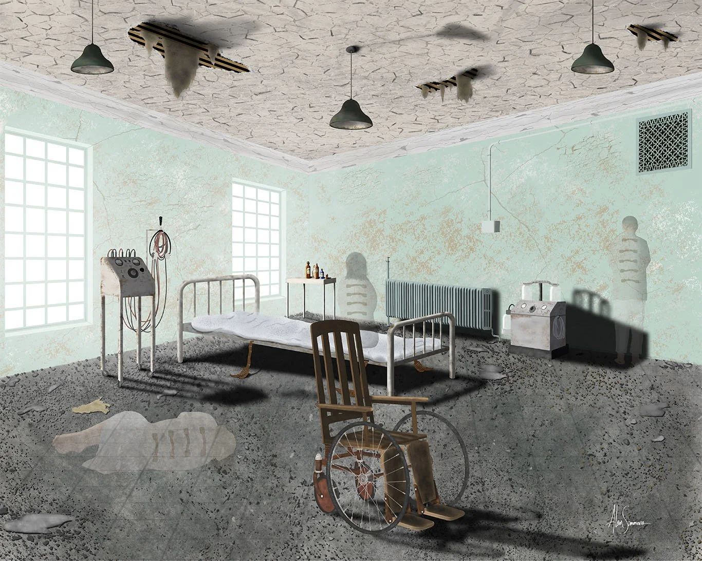 Ghosts (2024) is one of five pieces in my Abandoned collection, and offers a chilling view inside the ward of an abandoned asylum. Plaster and paint crack and peel from the ceiling and walls, and debris litters the floor. An empty wheelchair sits in the foreground. Beyond it, an electroconvulsive therapy machine stands beside an iron bed. Around the ward are three semi-transparent figures in straitjackets, ghosts of the ones who were abandoned long before the building was. Hand-drawn digital art. Prints available in 20 x 16, 10 x 8, and 7 x 5.