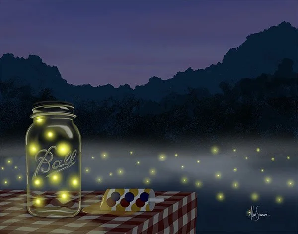 Summer 1979 (2023) offers a nostalgic memory of summer nights in the 70s. A picnic table draped in the iconic red and white checkered plastic tablecloth occupies the foreground. On it, fireflies explore an open mason jar as an orange push-up pop slowly melts in the thick summer air. Beyond, the darkening twilight sky overlooks a glow of fireflies hovering and blinking in the evening mist. Hand-drawn digital art. Prints available in 14 x 11, 10 x 8, and 7 x 5.