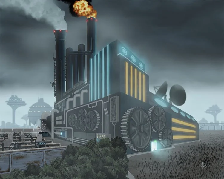 The Machine (2024) depicts a behemoth dystopian workplace set against the backdrop of a futuristic cityscape. As the massive gears grind and clank, workers make their way from the distant walkway to gather in front and wait to be scanned for entry. A row of trees seems to soften the bleak exterior, but beyond them is a towering steel wall that hides a matrix of pipes, and the sinister truth. Hand-drawn digital art. Prints available in 20 x 16, 10 x 8, and 7 x 5.