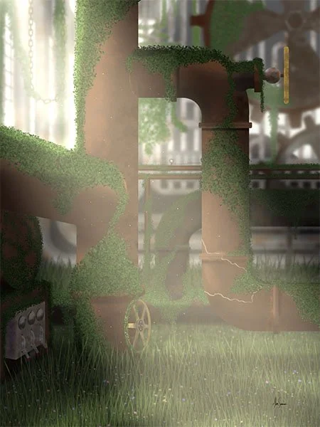 Reclaimed (2025) imagines a world after the extinction of the human race, a world in which nature reclaims the spaces taken from it; cityscapes, subdivisions, and industrial sites. This rendering features the remains of a factory covered in vines and climbing foliage. In the background, massive gears are now still and silent. Before them, a maze of small pipes cross the space. Brilliant sunlight streams through the factory windows. The foreground is occupied by huge rusting pipes, under which grass and flowers have broken through the concrete floor in a beautiful resurgence. To the left sits a control box, its gauges now dark and its levers in the Off position. Hand-drawn digital art. Prints available in 18 x 24, 8 x 10, and 5 x 7.