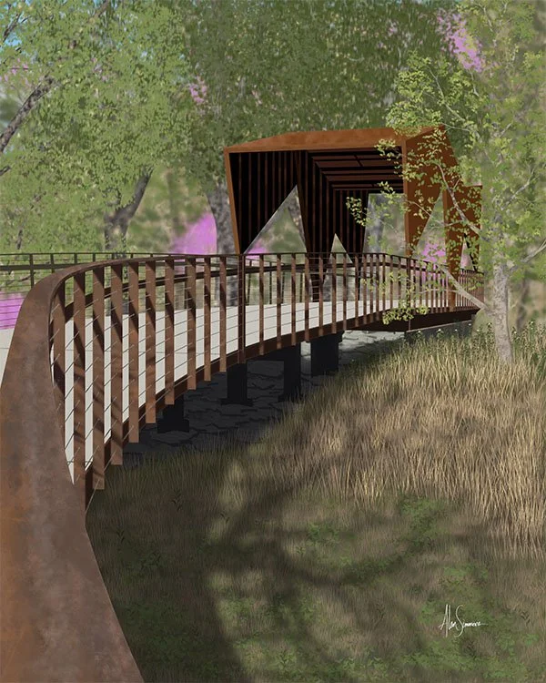 Springtime at Coler (2025) features a springtime view of one of the covered singing bridges in Coler Mountain Bike Preserve in Bentonville, Arkansas. The path winds gracefully through the surrounding trees and across the bridge, which hums with sound. The bridges are a sonic art installation by artist and musician Craig Colorusso. Hand-drawn digital art. Prints available in 16 x 20, 8 x 10, and 5 x 7.